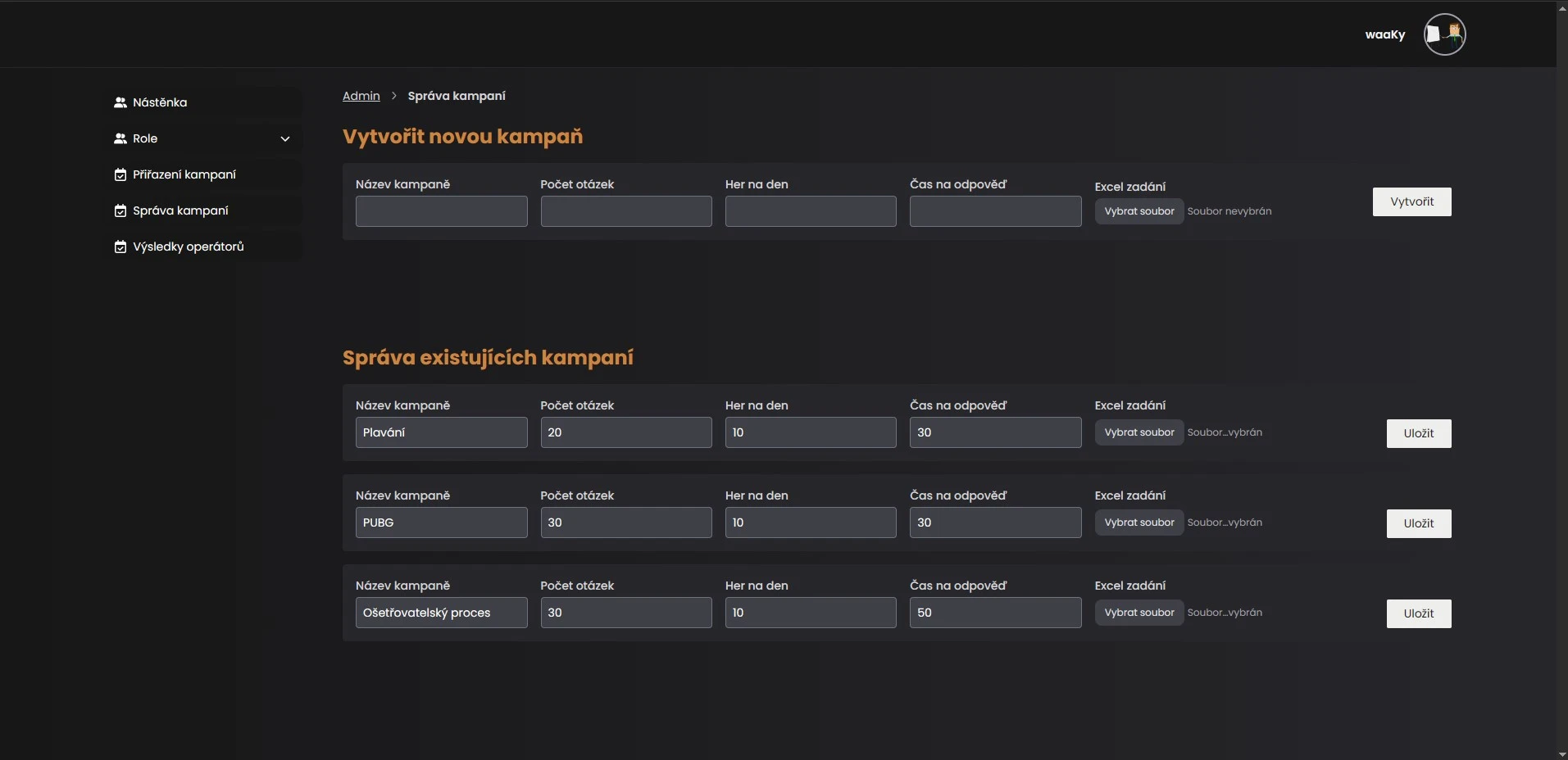 Potřebujete kupříkladu školící aplikaci pro zaměstnance? Stačí nahrát Excel soubor s připravenými otázkami, vytvořit kampaň, přiřadit kampaň zaměstnancovi, kterého si vytvoříte v administračním rozhraní a vaši zaměstnanci můžou směle odpovídat na otázky v časovém intervalu. K dispozici je i zobrazení či export všech statistik, jednotlivých testů a tak dále.